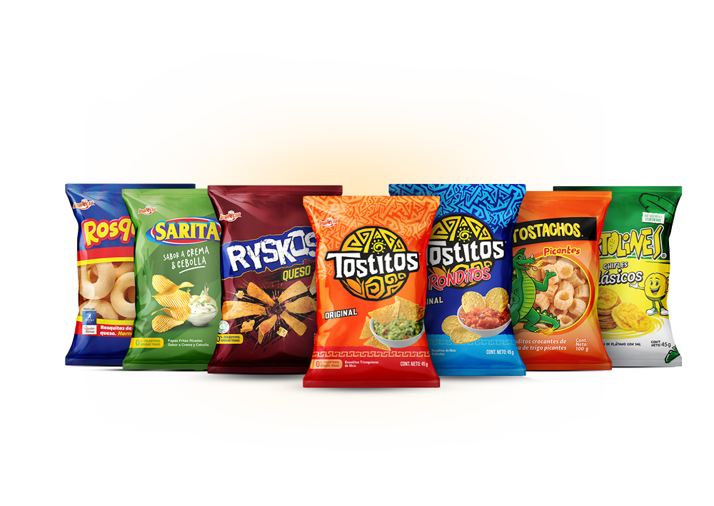 mix de bocaditos de papas sabor a crema y cebolla, plátanos con sal, extruidos de maíz con sal y chicharrones.